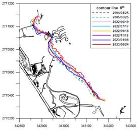 Based on the results of beach terrain monitoring over the years at Yenliao Beach in the Northeastern corner, it is evident that short-term variations in the monitored area are primarily attributed to typhoon events. The amount of sand and sediment variation varies depending on the path and scale of the typhoon events. Following these typhoon events, the beach terrain gradually shows signs of recovery and accretion as the influence of the northeastern monsoon weakens. The variations in sediment quantity and the position of the 0-meter contour line over the monitoring period are illustrated in Figures 1 and 2, respectively.