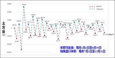 東北角鹽寮沙灘地形變動監測,根據歷年沙灘地形監測成果顯示:監測區鹽寮沙灘短期性變動因素為颱風事件,沙灘土砂變動量視颱風行徑及其規模有所差異,颱風事件後沙灘地形隨東北季風的減弱漸次呈現回淤變化,監測歷程之土砂量及0m灘線的變動情形分別如圖1及圖2所示。